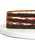 Шоколадні бісквіти просочені вишневим соком, що чергуються з ніжним кремом на основі вершкового сиру та ягодами вишні.