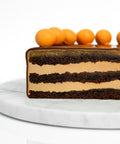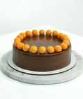 Торт із насиченими шоколадними бісквітами та абрикосовим просоченням, з ароматним абрикосовим прошарком. Вкритий шоколадною дзеркальною глазурʼю.