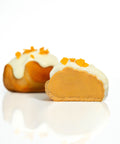 Ароматний, заварний профітроль із повітряним кремом на вареному згущеному молоці, вкритий шаром глазурі білого шоколаду та прикрашений шоколадною посипкою
